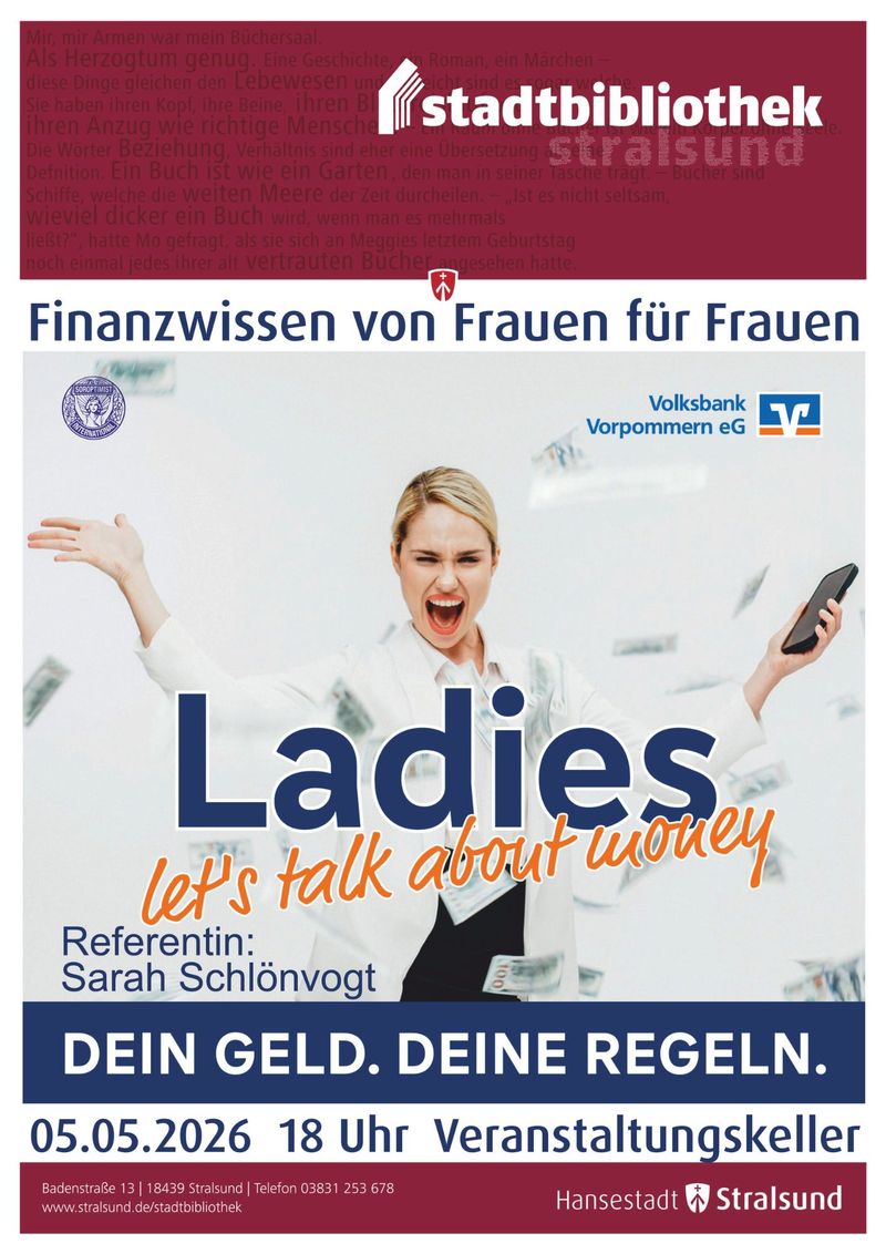 Über Geld spricht man nicht? Doch – und zwar offen, verständlich und auf Augenhöhe. Mit der Veranstaltung „Ladies, let’s talk about money“ laden die Volksbank Vorpommern eG, Soroptimist International und die Stadtbibliothek Stralsund Frauen dazu ein, ihre finanzielle Zukunft selbständig und selbstbewusst in die Hand zu nehmen.